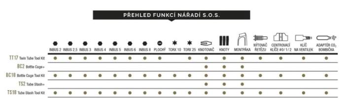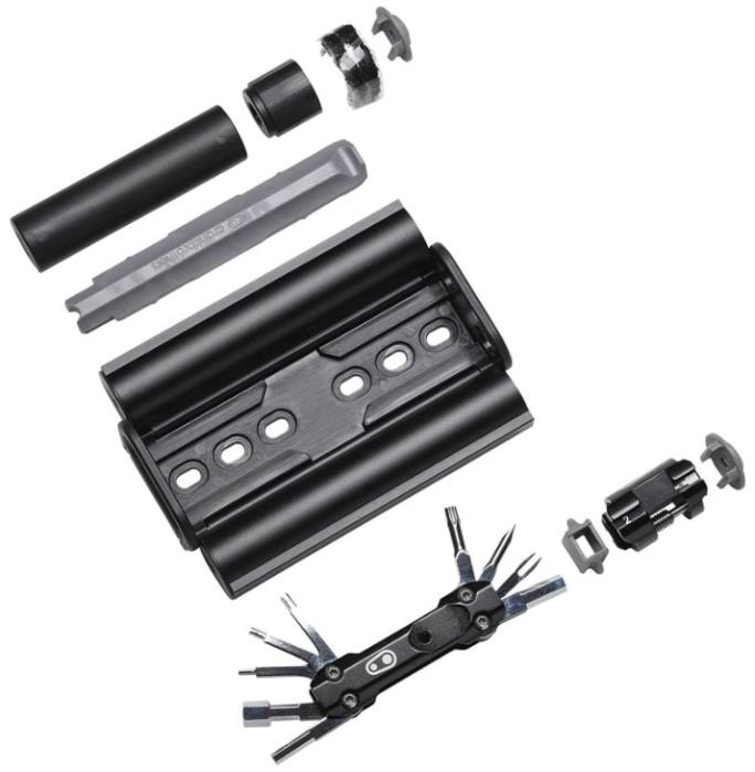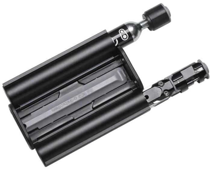 Komplexně řešené nářadí s prostorem na CO2 bombičku, které se montuje místo košíku nebo na jiná k tomu určená místa na rámu.